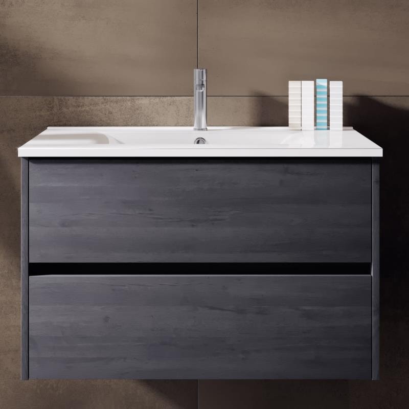 Wandhängender Waschtischunterschrank mit 2 Voll-Auszügen, mit Soft Closing Funktion, oberer Auszug mit Siphonausschnitt. Auszug mit Metallzarge und sehr leichtläufigen Schienen.Unempfindlich gegen Feuchtigkeit.