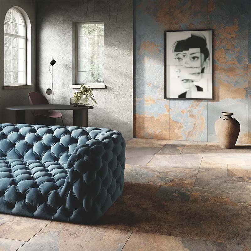 Die Slate Kollektion verwandelt die Natürlichkeit von Stein in einen zeitlosen Klassiker. Sie bringt die magische Atmosphäre der Berge und das Geheimnis des Schiefers in Ihre Wohnräume. Neben dem Farbton „River“ bietet die Kollektion auch drei monochromatische Farbtöne – Grey, Gold und Dark – sowie drei mutige Varianten: River, Natural und Flame. Diese Vielfalt verleiht der Kollektion eine moderne und lebendige Dimension.